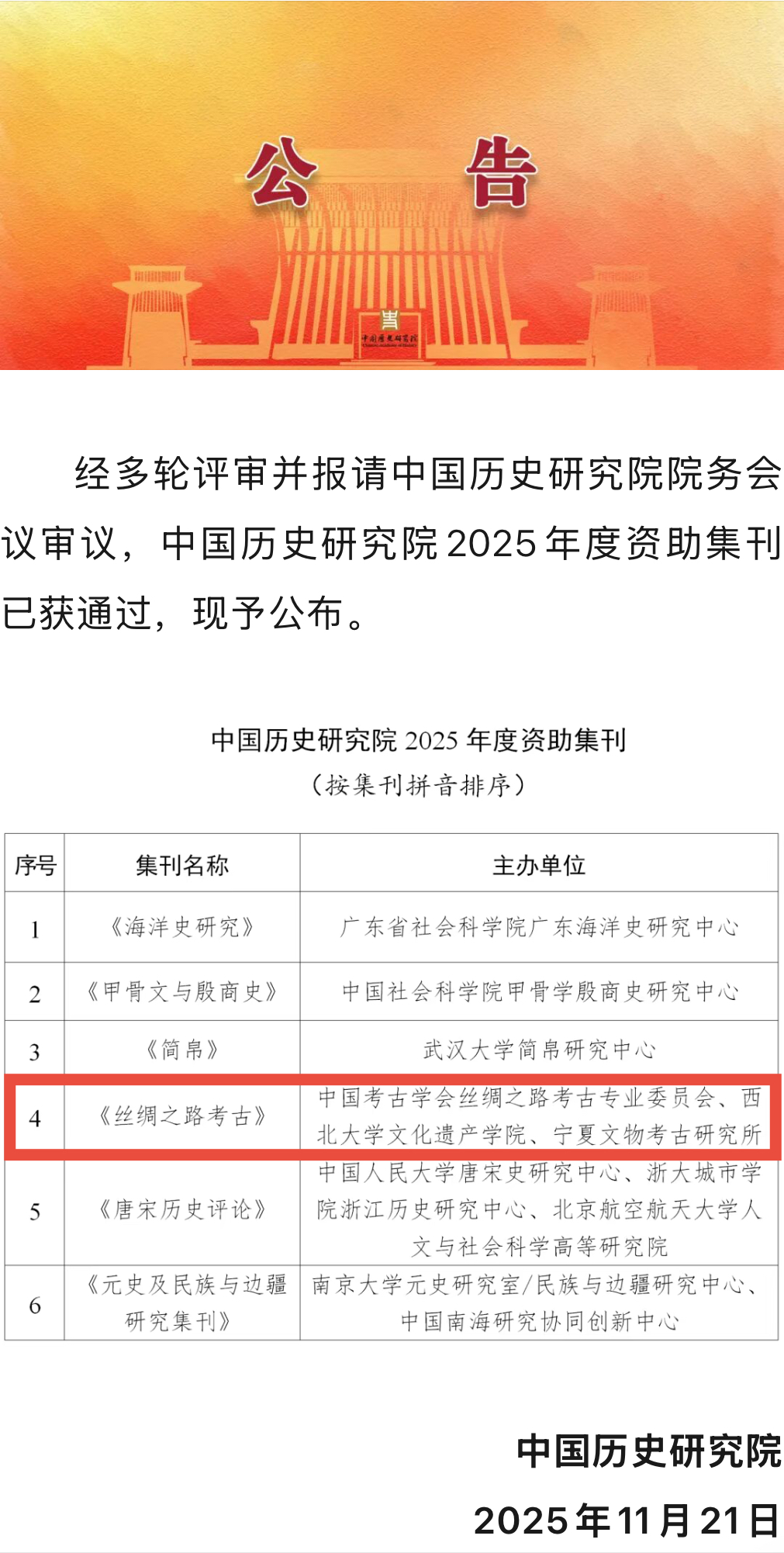 日前,中国历史研究院发布了2025年度集刊资助公告,我校文化遗产学院等单位主办的《丝绸之路考古》等6家集刊入选。