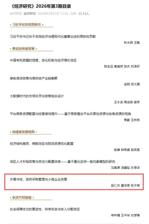 近日,我校经济管理学院赵仁杰教授与霍宇辰博士等合作的论文《外需冲击、政府采购管理与小微企业发展》在顶级期刊《经济研究》2026年第3期发表,该文是赵仁杰教授主持的国家自然科学基金面上项目、陕西高校青年创新团队项目的阶段性成果。